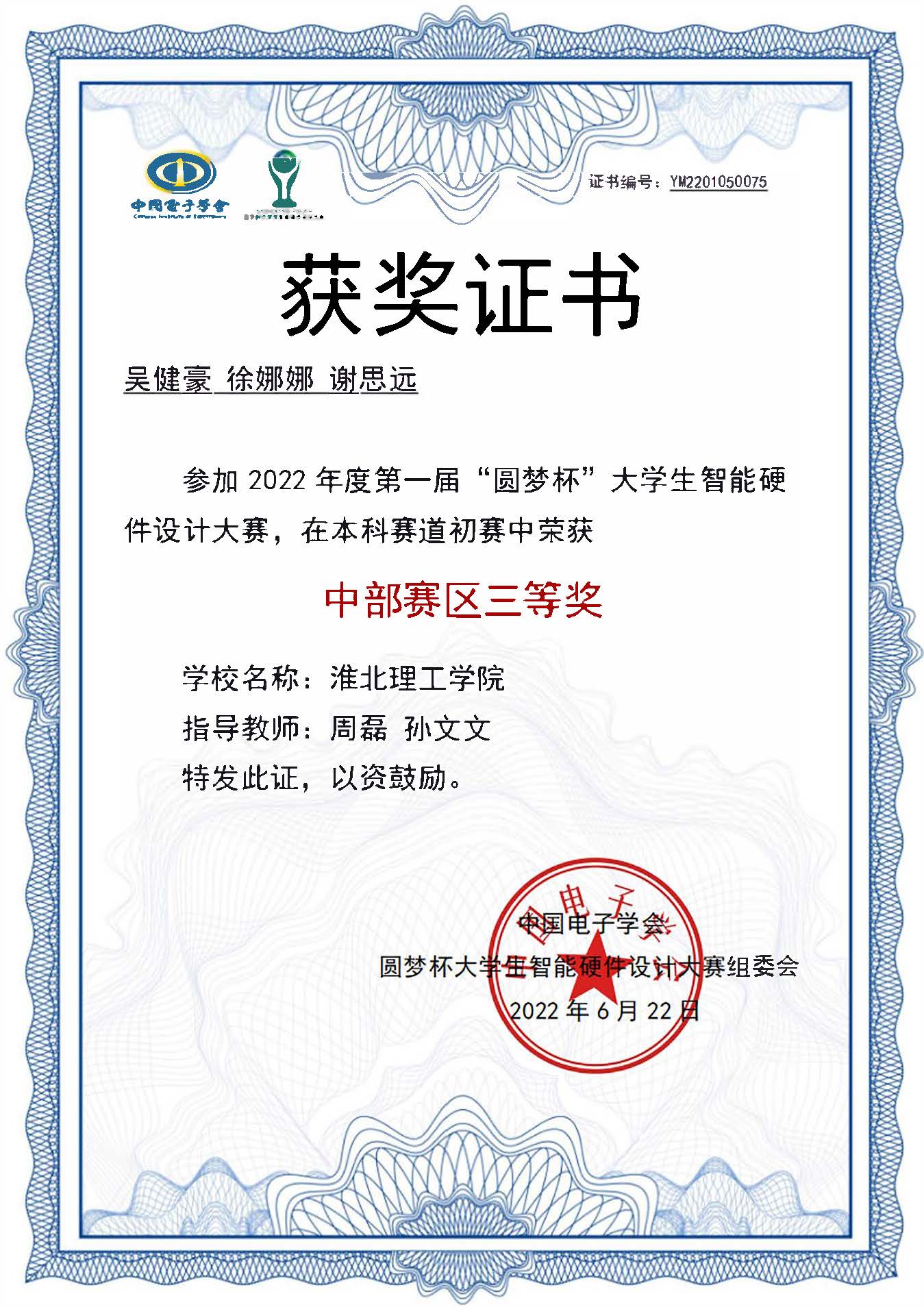 近日,由中国电子学会主办,北京航空航天大学、电子发烧友等单位承办的2022年第一届“圆梦杯全国大学生智能硬件设计大赛”的初赛落下帷幕。经过中部赛区(湖北、湖南、江西、河南、安徽)五个省份的激烈竞争后,beat365官网电子信息工程1班吴健豪、谢思远、徐娜娜同学组成的本科参赛小组荣获了中部赛区的三等奖。