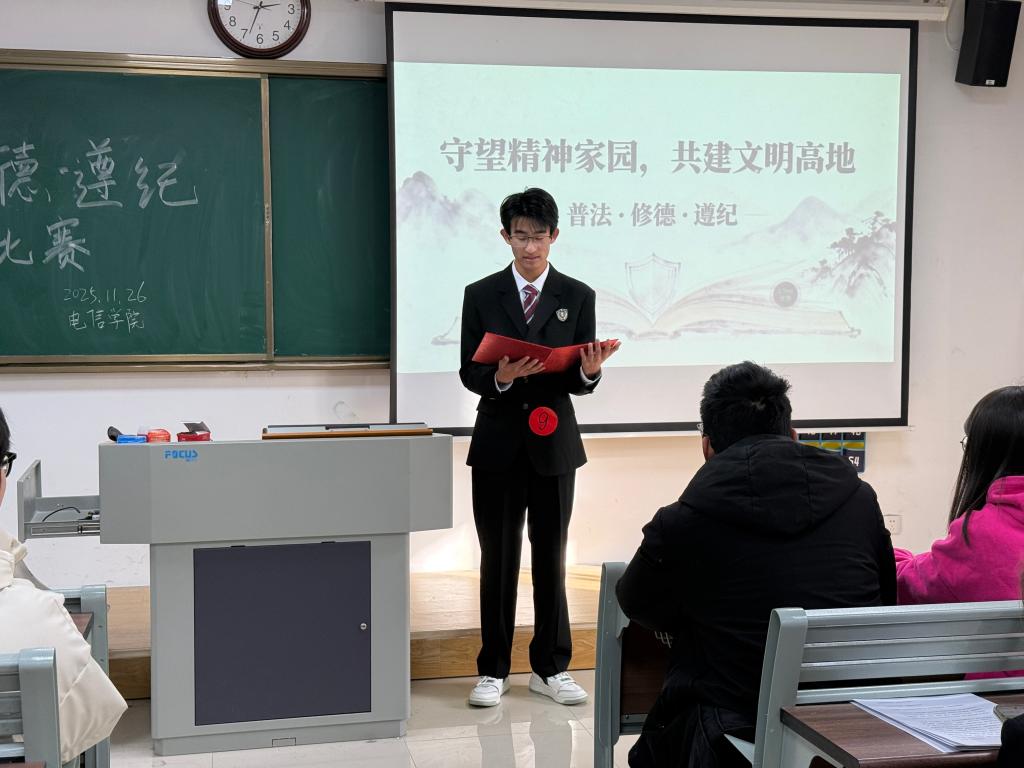 以讲践行,让修德遵纪成为行动自觉。演讲比赛不仅是思想的碰撞,更是文明实践的动员。参赛选手们从自身经历出发,分享在班级建设、志愿服务、社区实践中践行道德准则、遵守纪律规范的故事。比赛现场还设置“互动问答” 环节,评委们结合工科专业特色,就 “如何平衡技术创新与法律边界”“科研工作者的道德责任” 等问题与选手、观众交流探讨,引导学生将法治信仰、道德追求转化为日常行动,推动形成 “人人讲文明、事事守规矩” 的校园风尚。