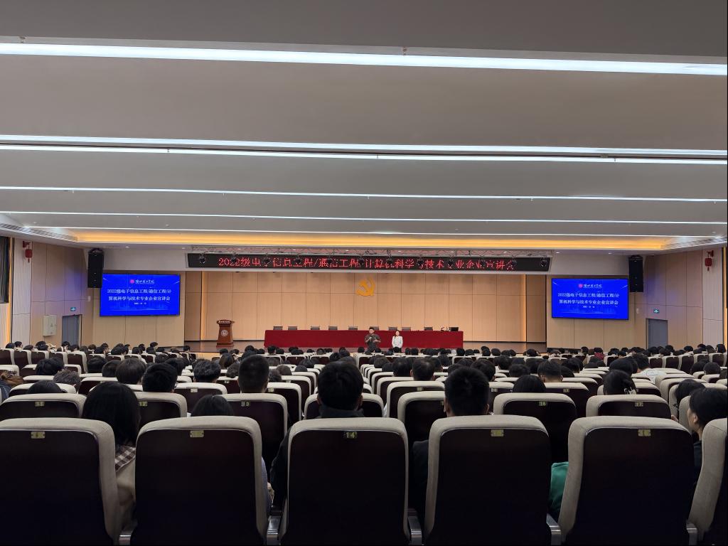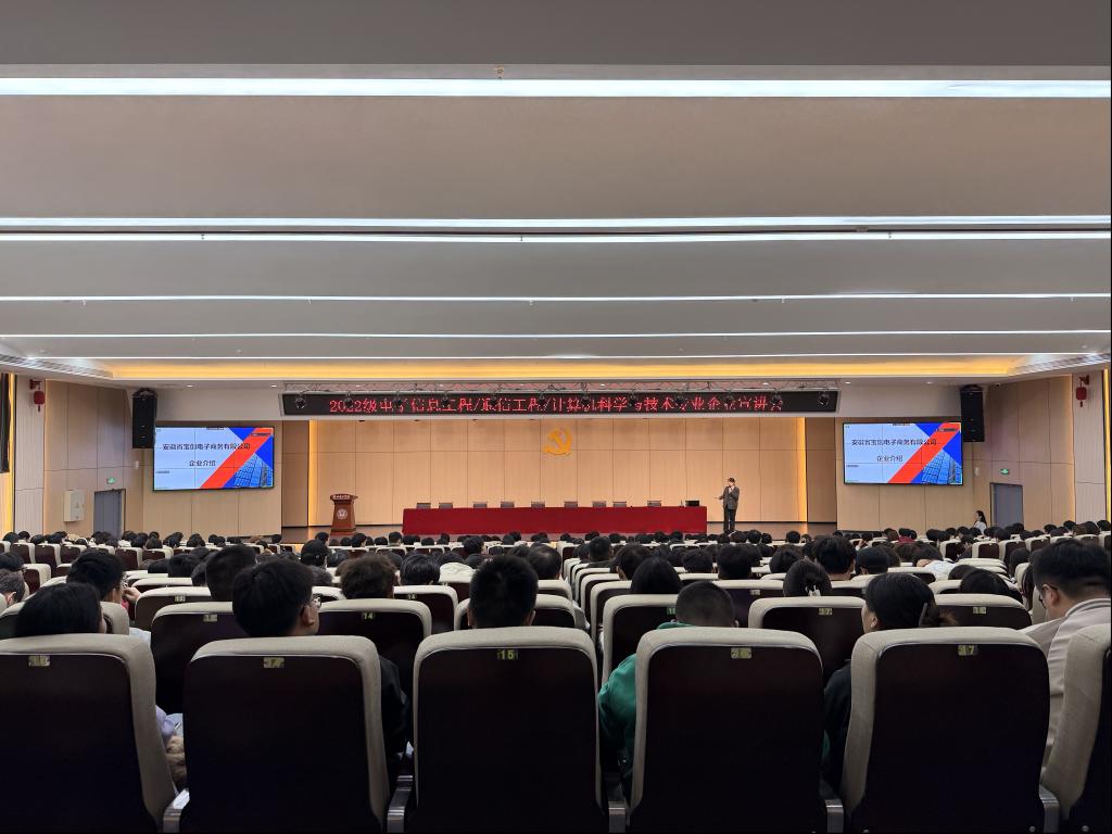 为扎实推进2026届学生专业实习工作,搭建校企协同育人平台,10月15日晚,beat365英国官方网站beat365英国官方网站在学校一楼报告厅成功举办专业实习宣讲会。本次活动面向2022级电子信息工程、通信工程及计算机科学与技术三个专业300余名学生,特邀安徽硅砚人工智能基础资源技术有限公司与安徽宝创电子商务有限公司两家本地优质企业来校,为学子们带来专业对口的实习岗位与成长机会。