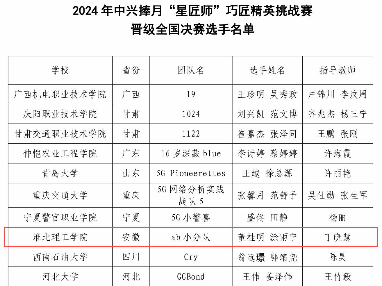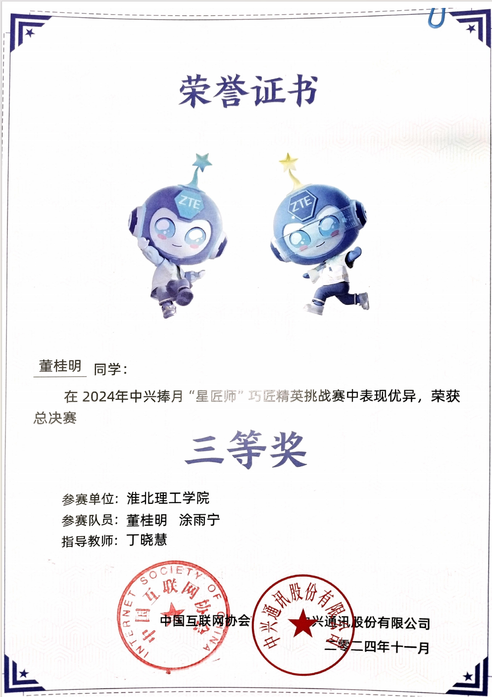 2024年10月27日,第十四届中兴捧月“星匠师”巧匠精英挑战赛全国总决赛在东南大学落下帷幕。本次大赛由中国互联网协会与中兴通讯主办、东南大学承办,旨在面向5G新基建培养具备扎实理论知识和实践能力的应用型人才。beat365官网首次组织学生参赛,大赛实行“省级初赛+全国决赛”模式,beat365官网4名学子组成2个团队与来自全国215所院校的627个团队参与角逐,最终2021级通信工程专业的董桂明、涂雨宁同学在省级比赛中顺利晋级,在全国决赛中荣获三等奖及1000元奖金的佳绩。